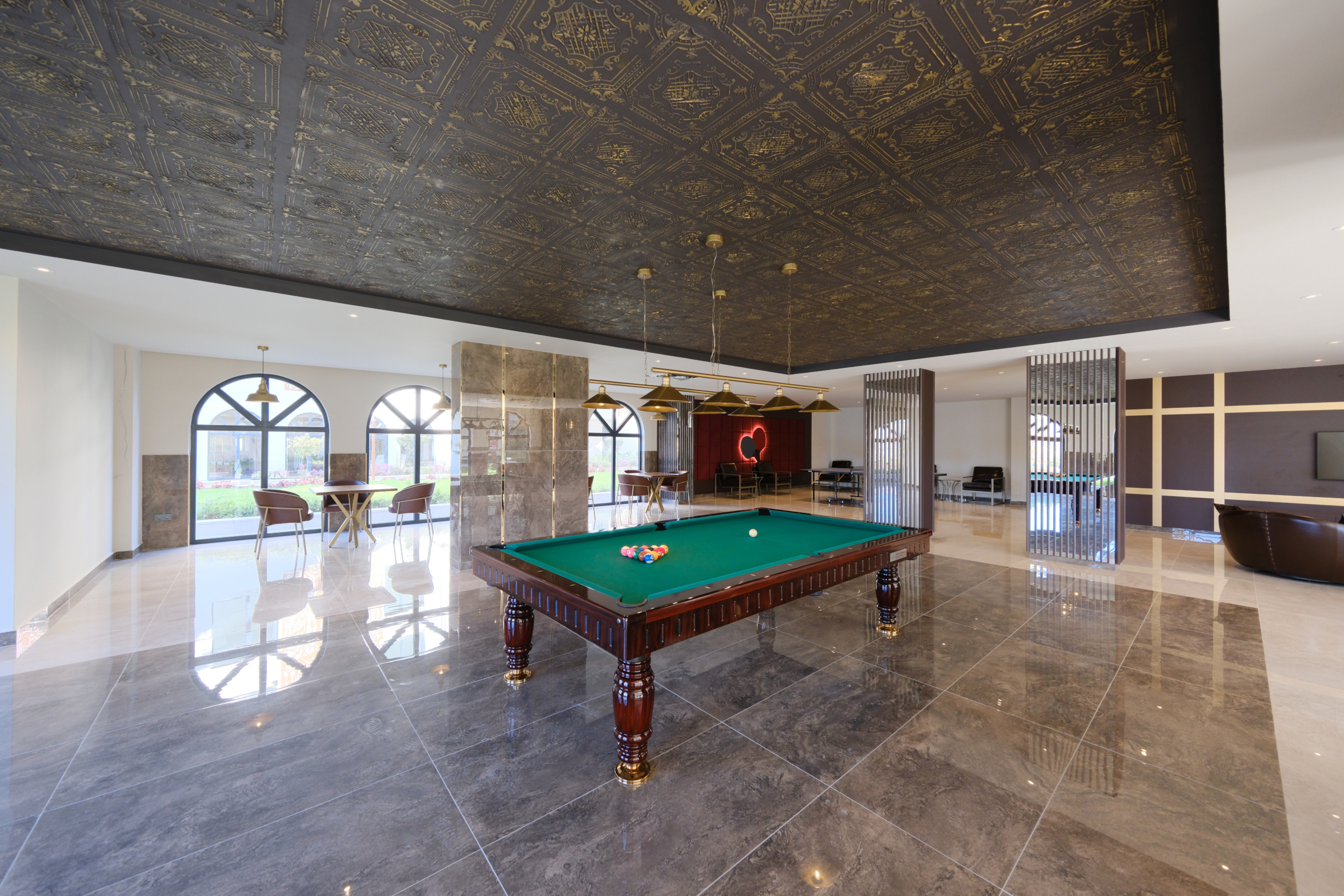 Amenities of the complex: outdoor swimming pool ( 700 m² ) , jacuzzi, children’s pool, children’s playground, yoga area, open-air cinema, indoor swimming pool, Turkish Hamam , steam room, sauna, heated jacuzzi, massage rooms, relaxation zone, fitness suite, children’s playroom, billiard , table tennis, library, co-working space, cafe, conference hall, glass winter garden, BBQ area
